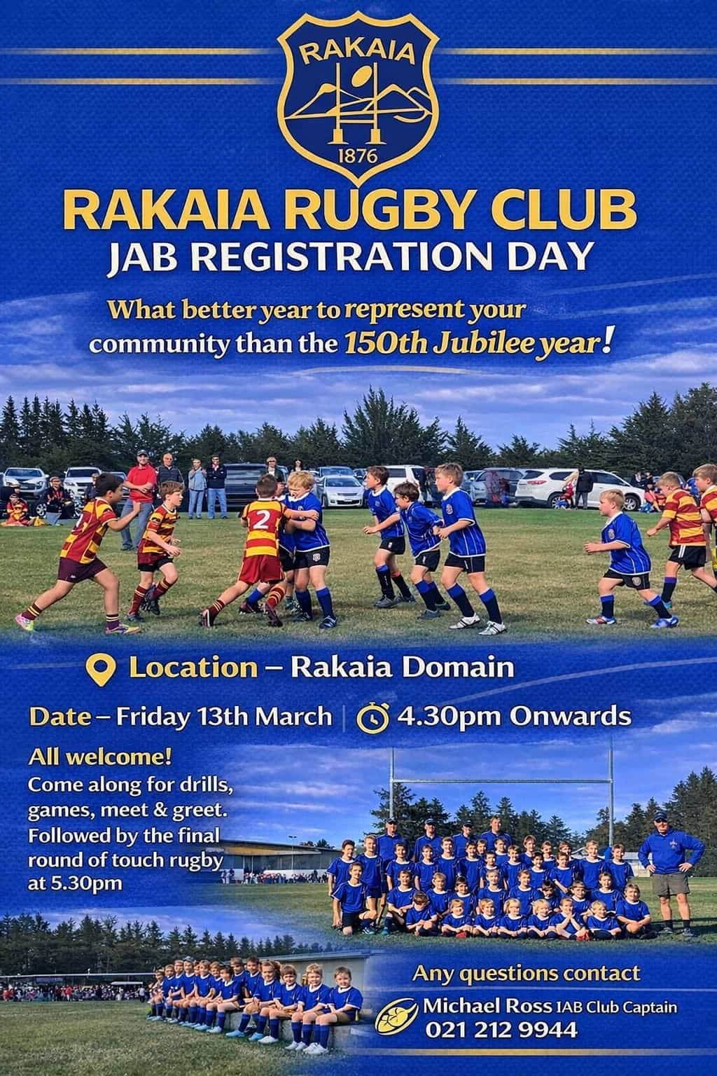 The Rakaia Rugby Club supplies all our players with a Club jacket, playing jersey, shorts, socks, a Mouthguard and a practice rugby ball.